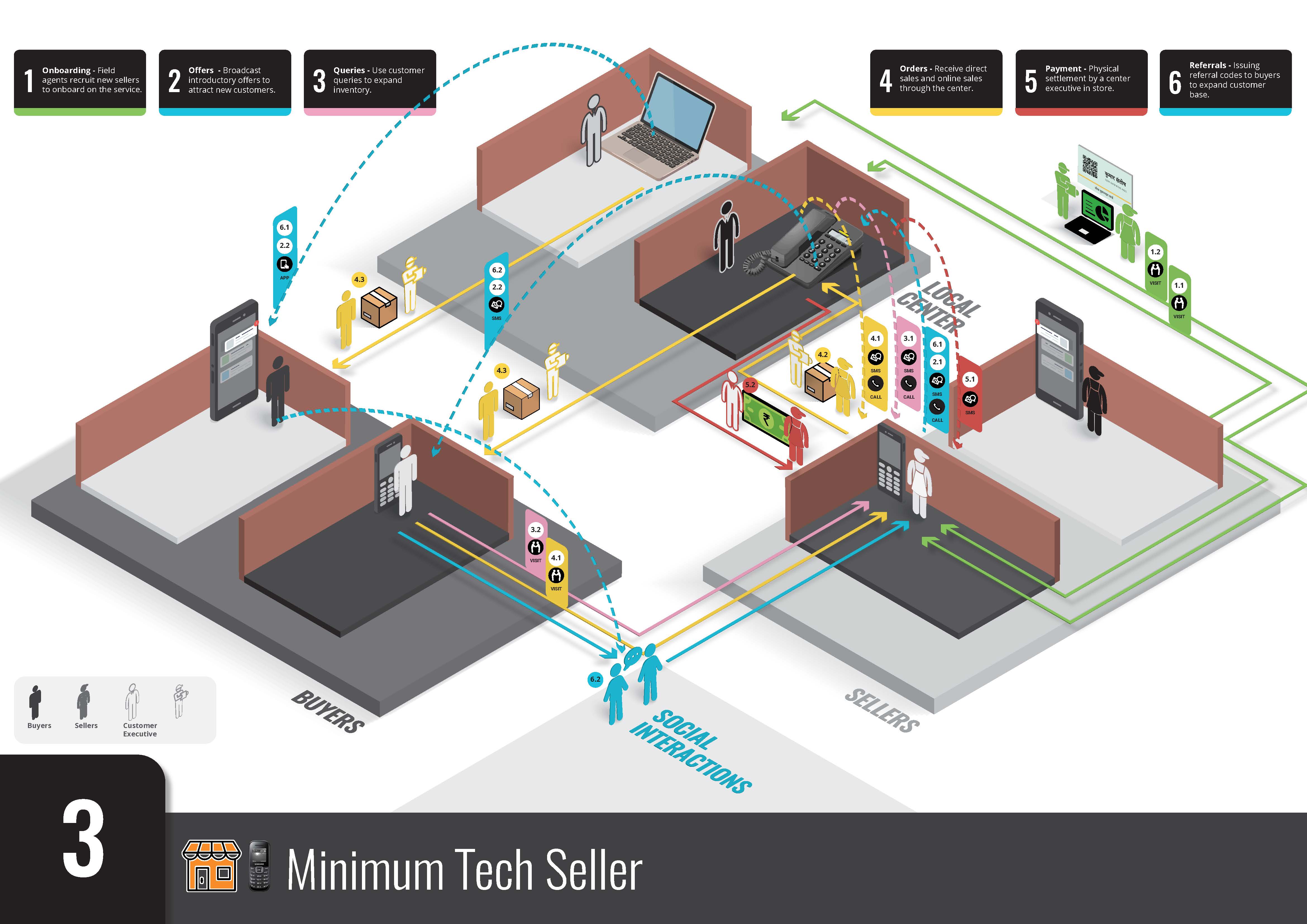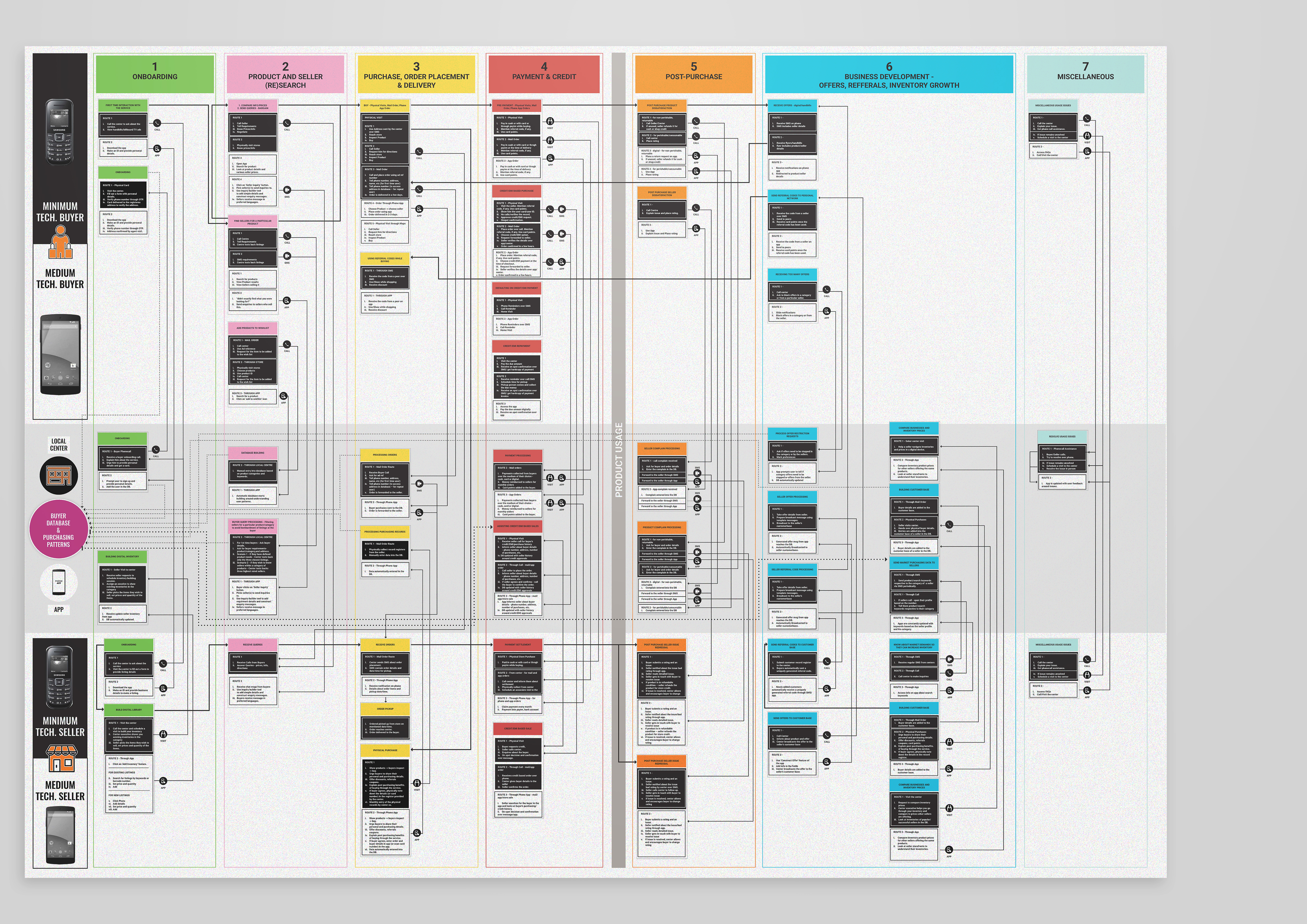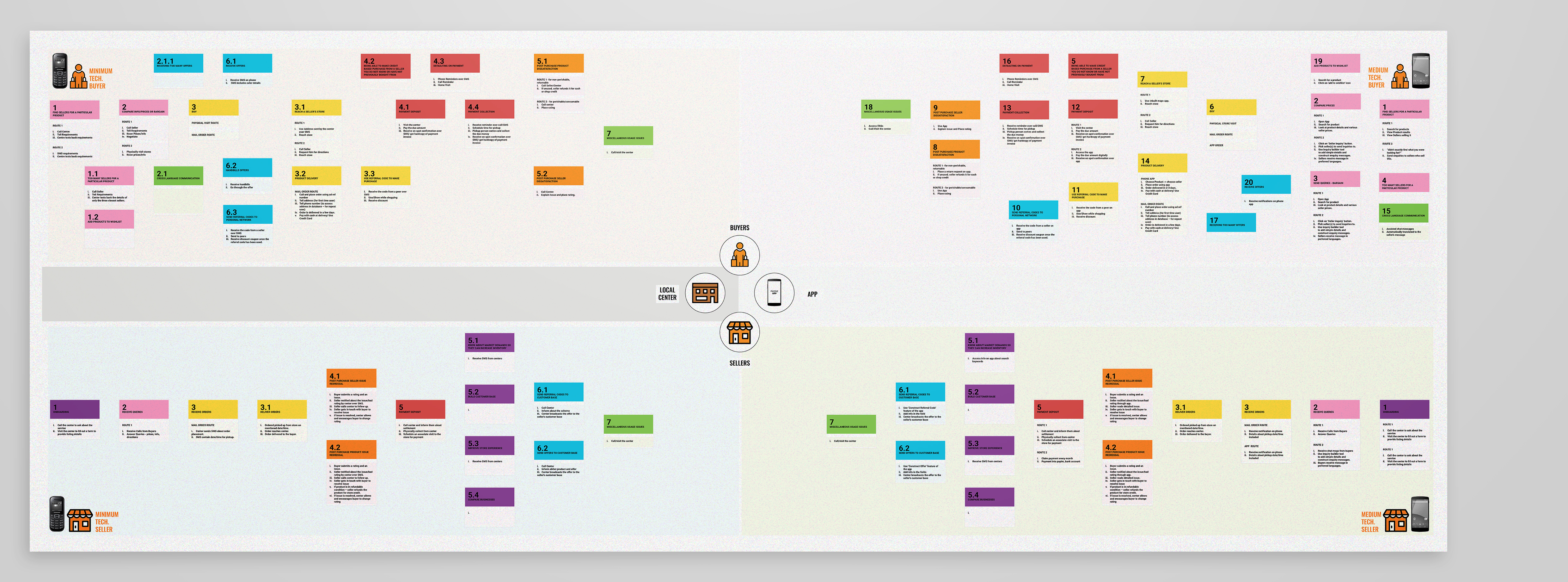 So instead of showing four journeys simultaneously I decided on configuring them as two journey (one for the buyers and one for the sellers) and describing each step both through a minimum tech and a medium tech route.