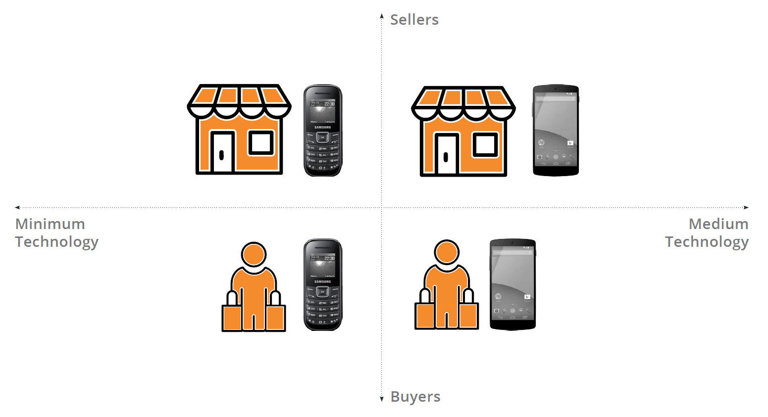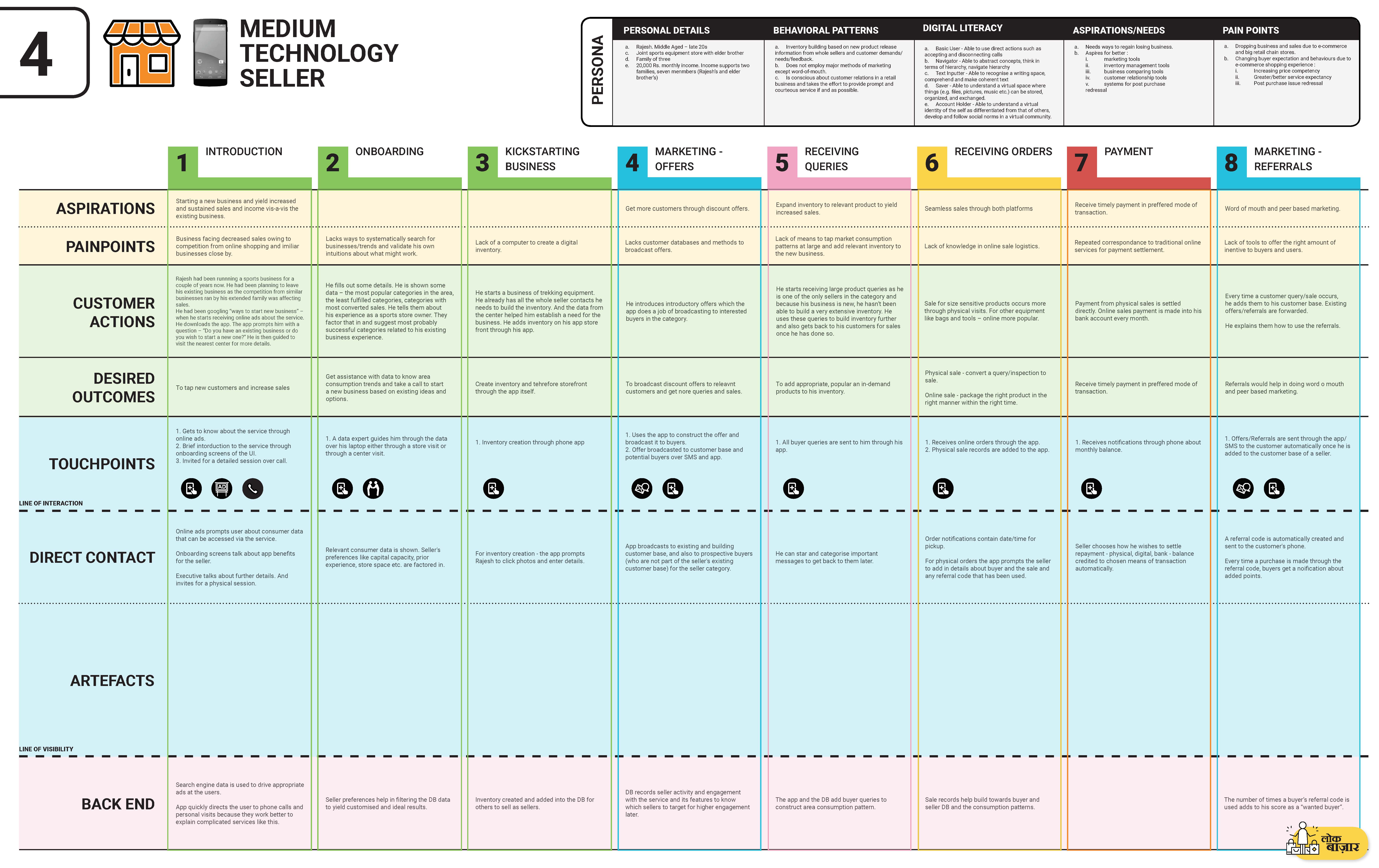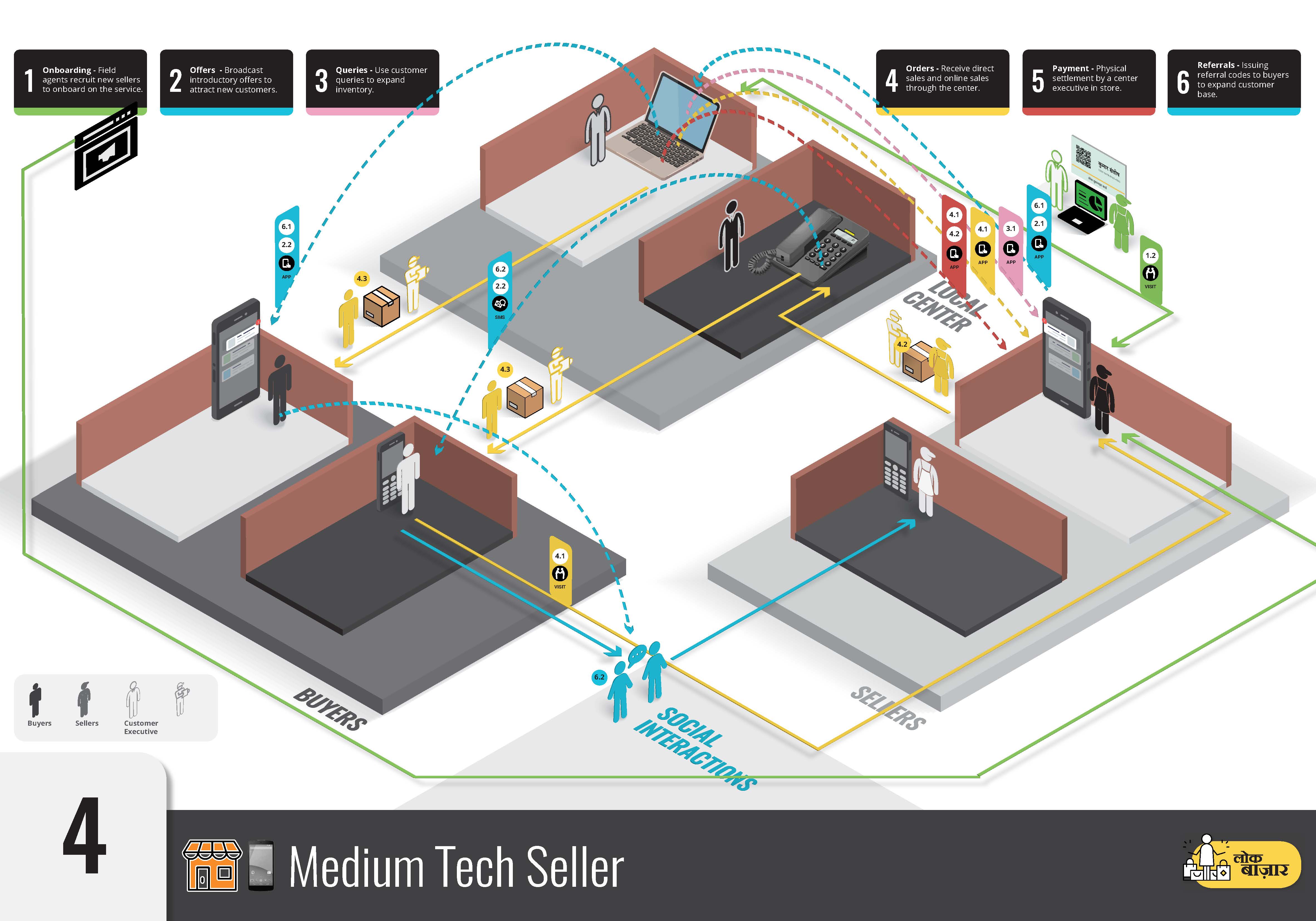 So instead of showing four journeys simultaneously I decided on configuring them as two journey (one for the buyers and one for the sellers) and describing each step both through a minimum tech and a medium tech route.